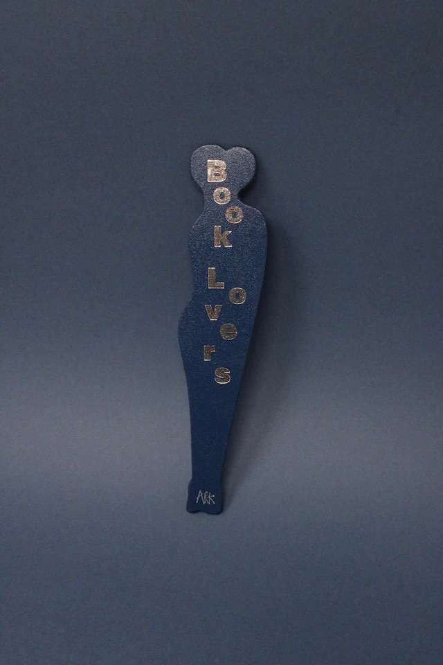 A figurative line drawing on one side, BOOK LOVERS embossed in metallic foil on the reverse with a contrast leather colour.