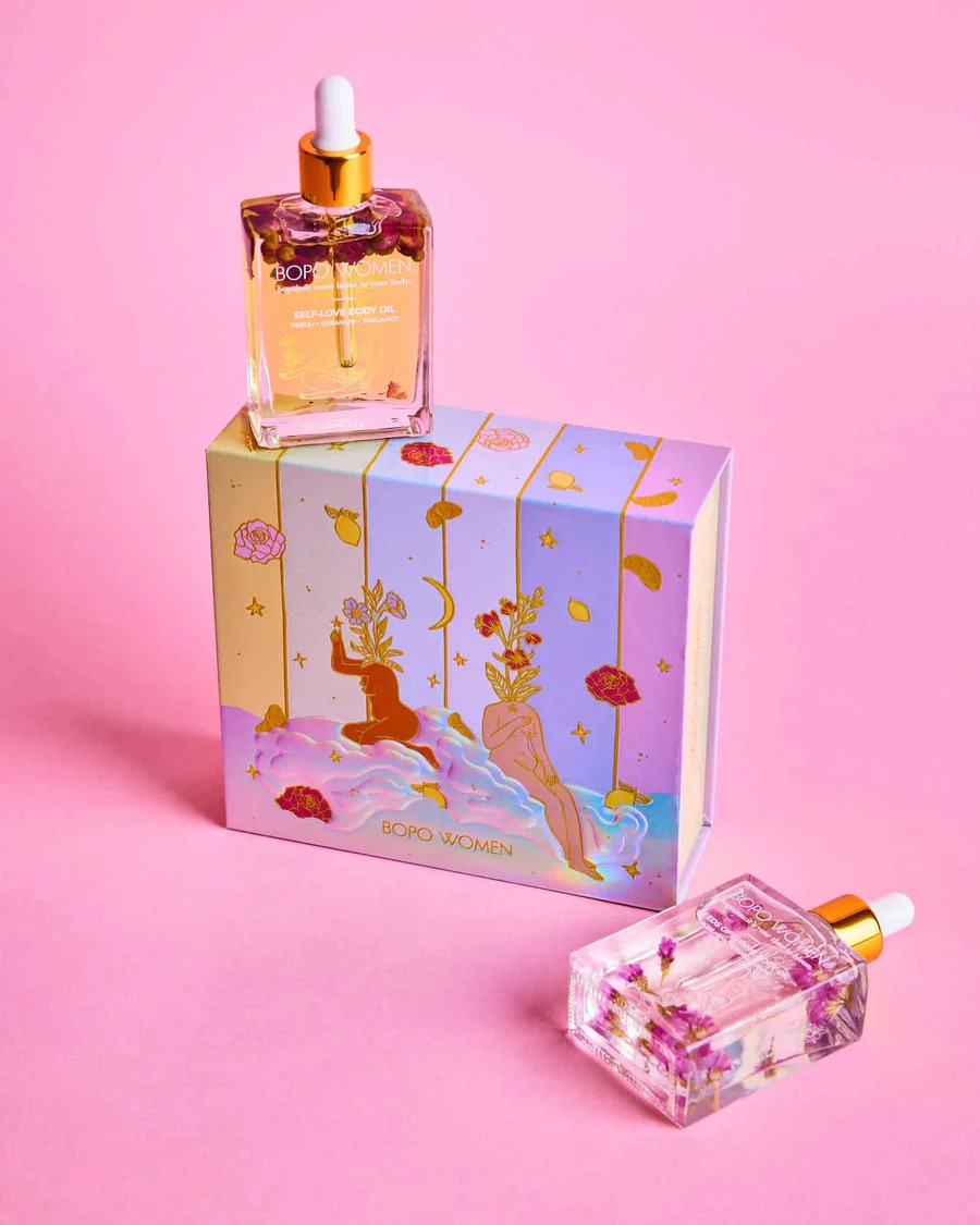 The perfect duo set for the skincare lover, starring two nourishing flower-infused body oils. Our Mini Seeds of Spring Body Oil is infused with hand-picked florals and features a nourishing blend of fragrant essential oils. Let rose top notes and grounding sandalwood base notes transport you to flower fields, while deeply hydrating your skin. Our Mini Self-Love Body Oil combines geranium, bergamot, mandarin & neroli essential oils to infuse the skin with vitamins, fatty acids and antioxidants. The perfect gift for someone special, your bestie or for yourself – because we could all use a little more self-love in our lives.