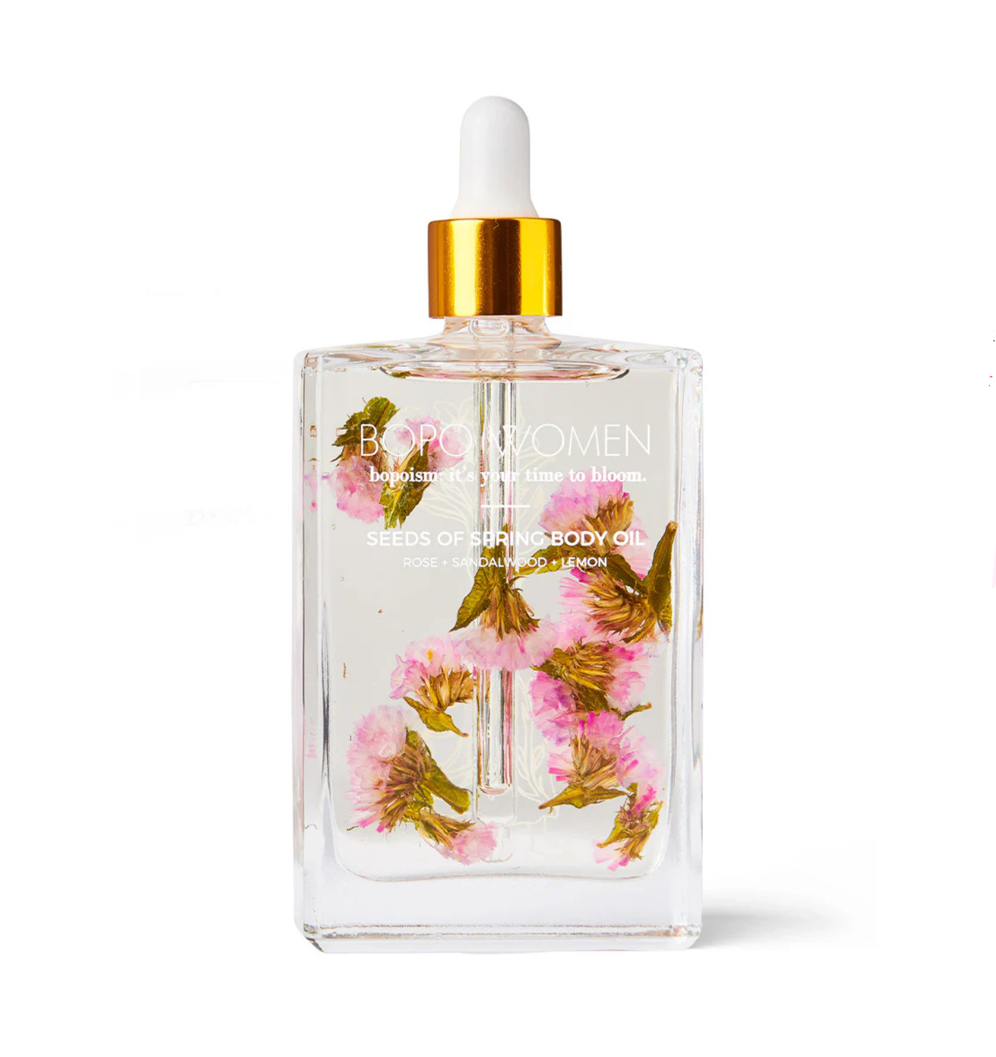The all natural Seeds of Spring Body Oil features a nourishing blend of fragrant essential oils. Let floral rose top notes and the grounding base notes of sandalwood transport you to the beauty of Mother Nature awakening from her slumber after a long, cold Winter. It’s your time to bloom. Please Note: flower bunches are hand dried and then picked by warehouse staff so due to seasonality flower colour may vary.