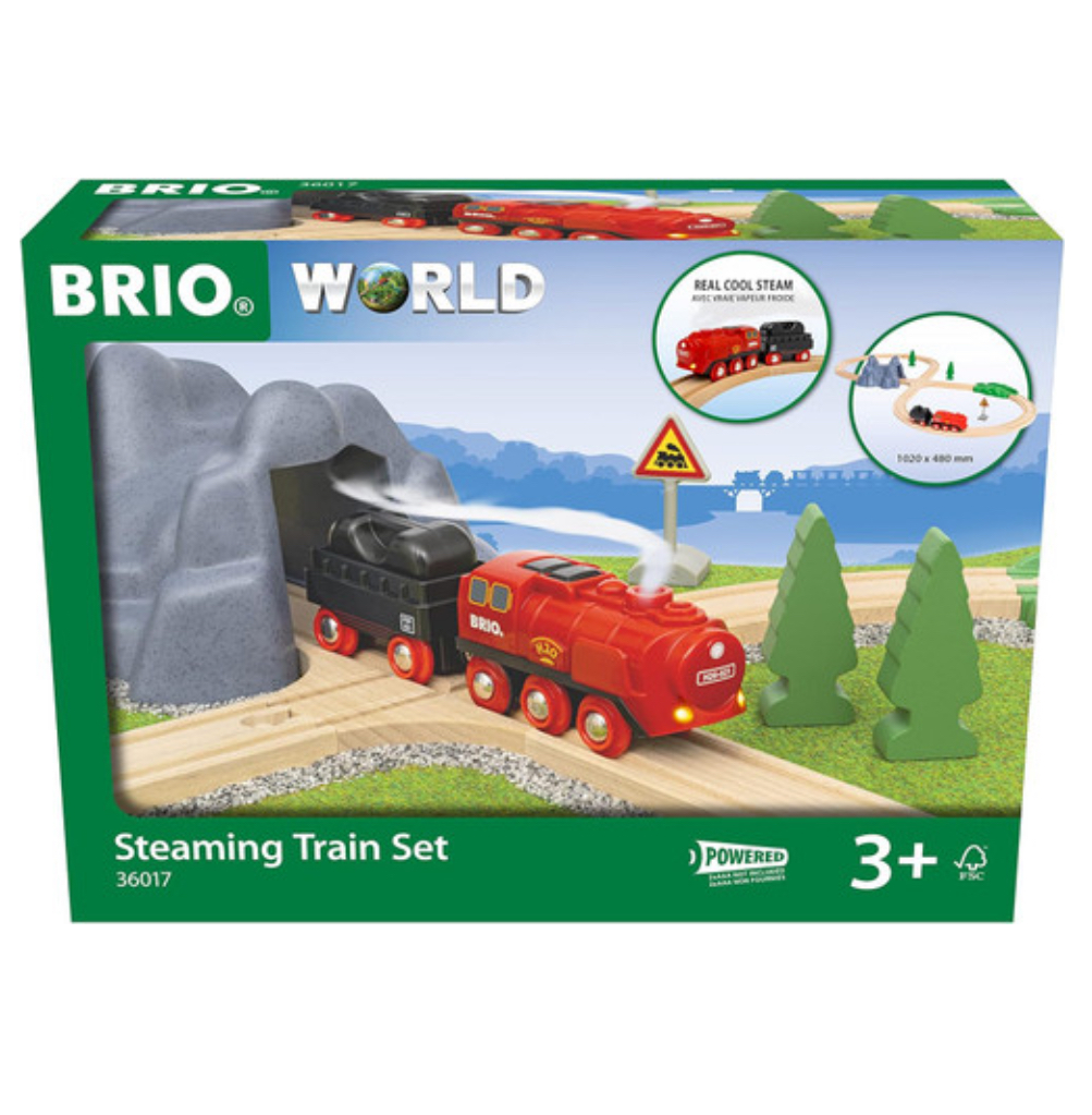 Chug around this classic figure 8 train set with realistic steam effects in the Steaming Train Set. The red battery-powered engine produces safe-to-touch steam as it drives around the tracks. Once you’re out of water, simply refill the engine using the refill load that’s pulled behind the train. Press the red forward button on the top of the engine, the front lights turn on as the steam starts to rise and you’re off again on more classic wooden railway adventures.