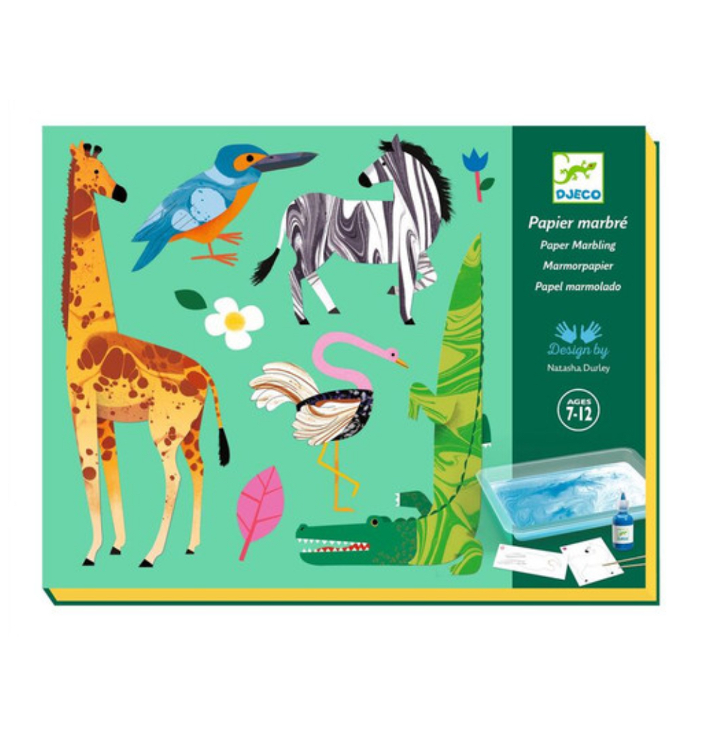 An activity to learn how to marble the paper with coloured inks. Children can explore the technique as they complete the animals of the 4 paintings with stickers that they have “printed” themselves. They can pour the inks drop by drop then mixes them: they will observe the colours intertwine without blurring. They can then deposit the stickers on the surface of the bath to transfer the patterns to the paper. The patterns created are transferred to the paper as if by magic.