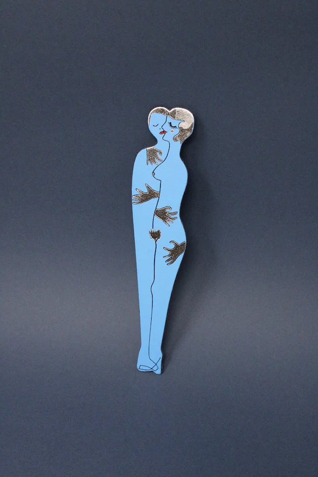 A figurative line drawing on one side, BOOK LOVERS embossed in metallic foil on the reverse with a contrast leather colour.