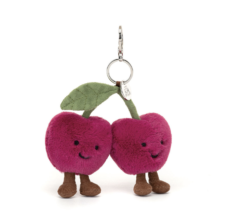 Wardrobe flair? Take it to go! A duo of cheerful cherries with soft plush skins, suedette stalks and a silver clasp, Amuseables Cherries Bag Charm is the perfect accessory for those who like to travel in style.