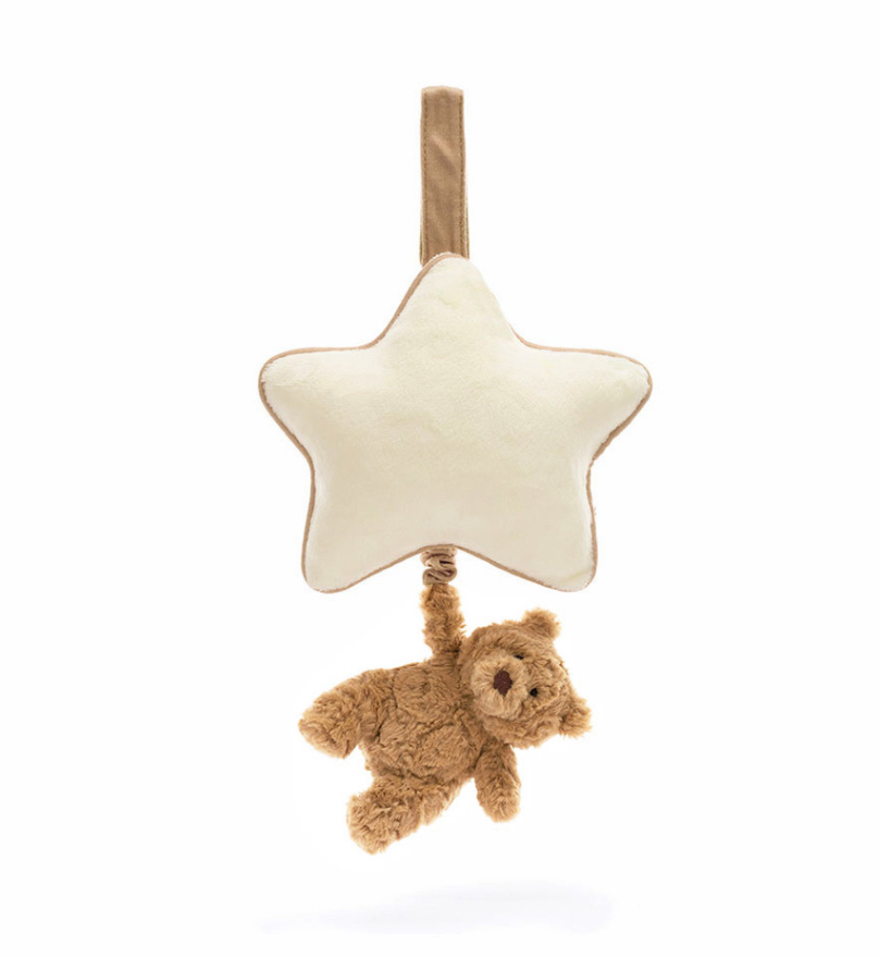 Bartholomew Bear is reaching for the stars with this Musical Pull. A tiny version of our most loved character, with signature choc-drop nose and rounded tummy, can be pulled to play an original Jellycat lullaby. With a velvet soft star edged in cinnamon piping, which can be fastened onto a crib or pram, this sleep time treasure brings golden slumbers.