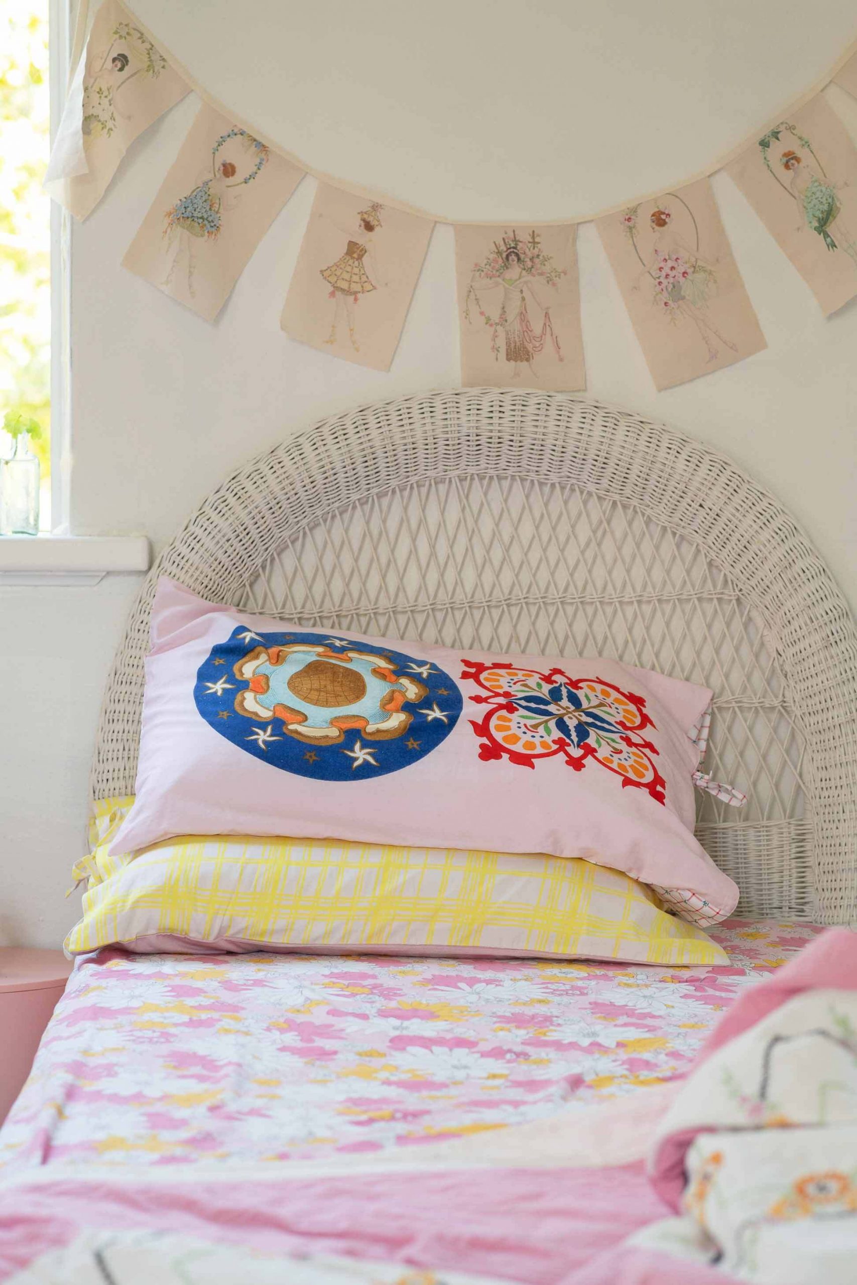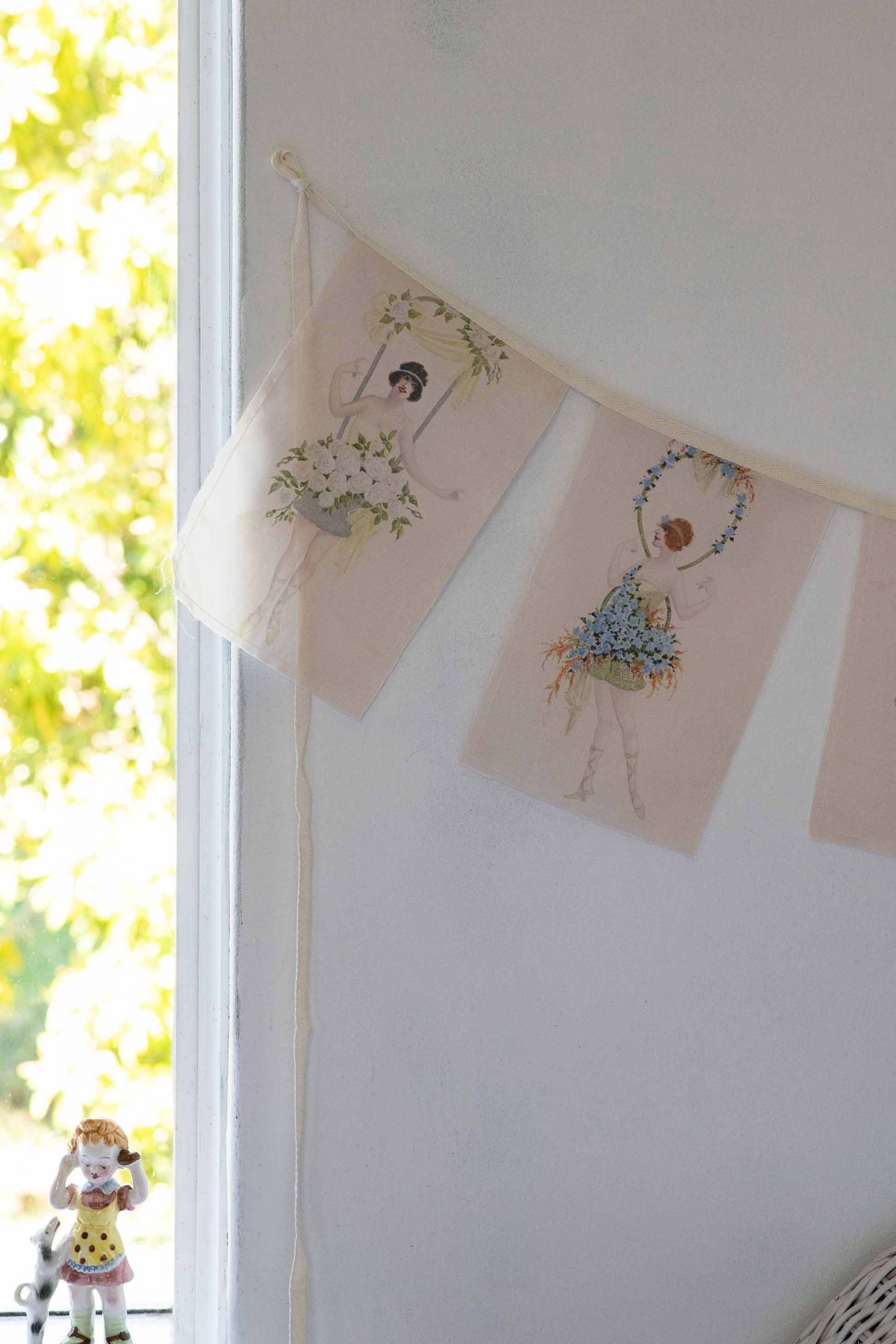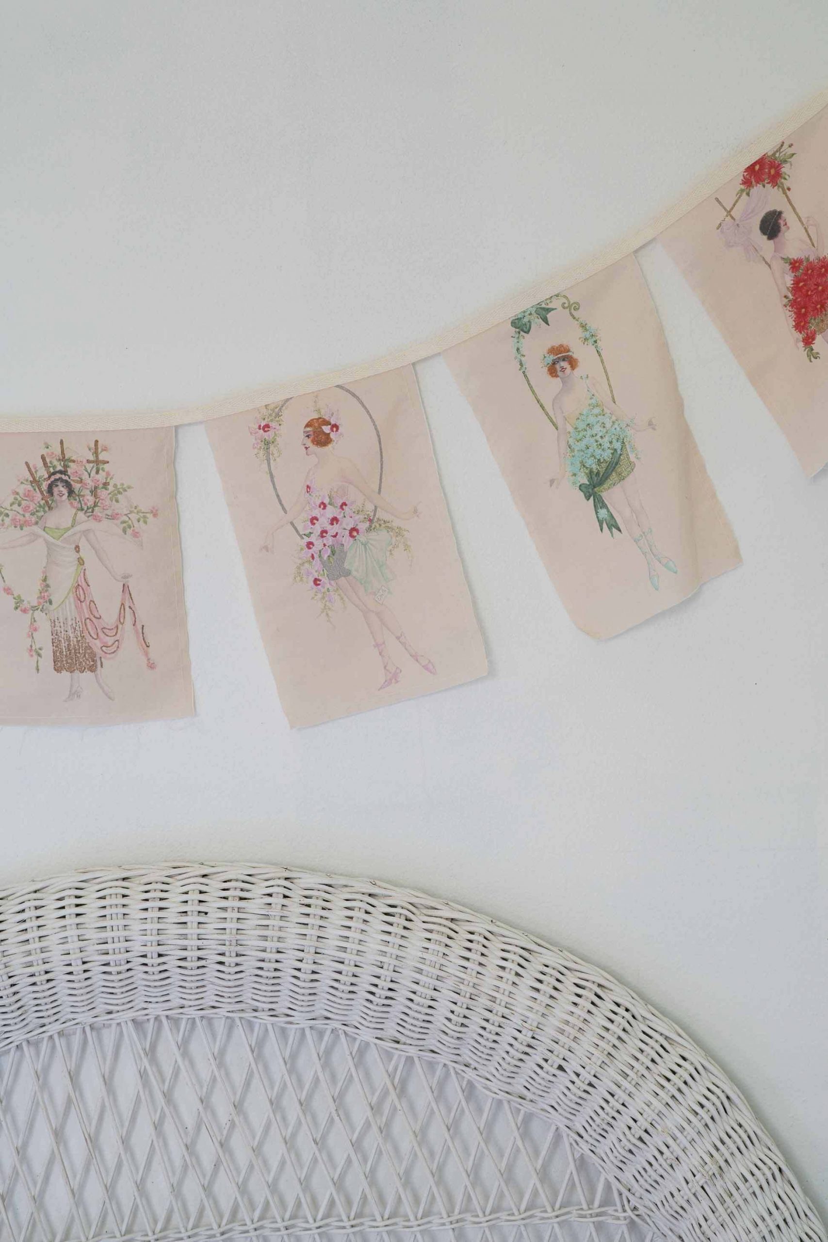 The garlands feature gorgeous watercolours digitally printed onto organic cotton and cut into little flags. The edges are kept raw with a simple stay stitch.