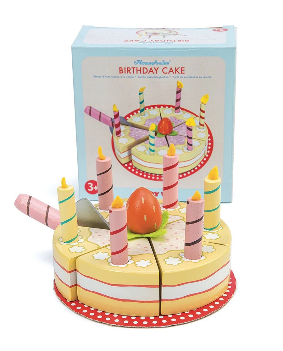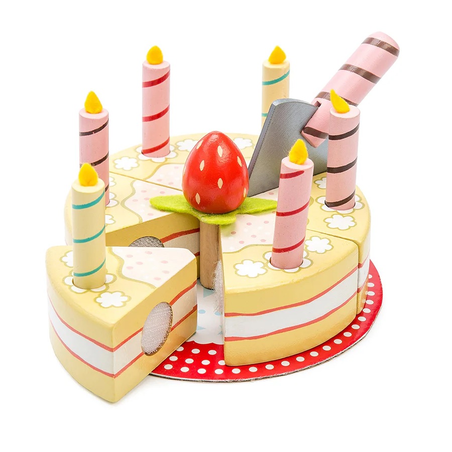 Happy birthday! Slice the wooden cake into 6 segments using the cake slicer.