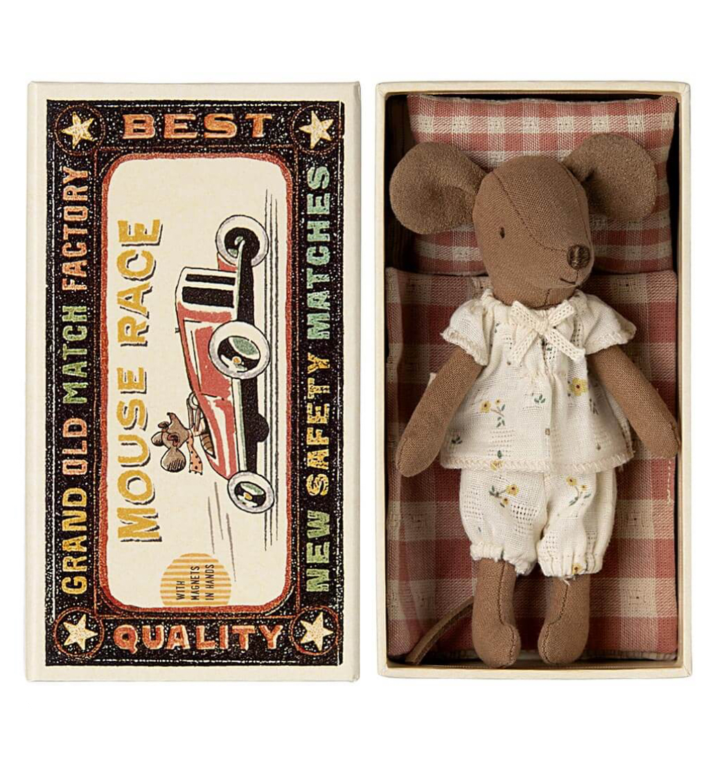 A classic Maileg item. This mouse is ready for hours of play and sleeps tight in the little matchbox. The clothes and bedlinen are made of soft fabrics with unique prints in beautiful colors. Extend the story by adding accessories to the play.
