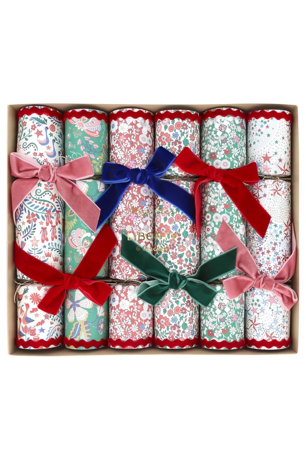 We’ve collaborated with Liberty to bring elegance to your Christmas dinner and celebrations. These luxury party crackers, featuring Liberty prints in a blend of timeless and contemporary joyful colors, add an instant touch of sophistication. Soft velvet bows and red velvet ricrac elevate the look even further. A delight both inside and out, each cracker reveals a gold foil paper crown, a joke, and a Liberty print paper star-shaped tree decoration with a luxurious velvet bow. Driven by discovery, Liberty has been home to the artistic shopper since 1875. Famed for its directional design and celebration of craftsmanship, its prints are created in the heart of London by the Liberty design studio.