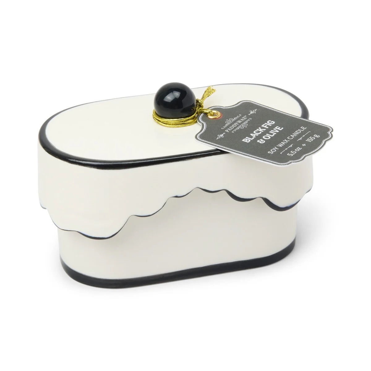 The Black Fig & Olive candle comes in a large porcelain vessel with hand-painted black-and-white details along the scalloped rim and knob. Fragrance notes include green olive leaves, Meyer lemon, black figs, and tonka bean layered over musk and wood. When the candle is finished, the vessel can be repurposed as a trinket dish or decorative accent.