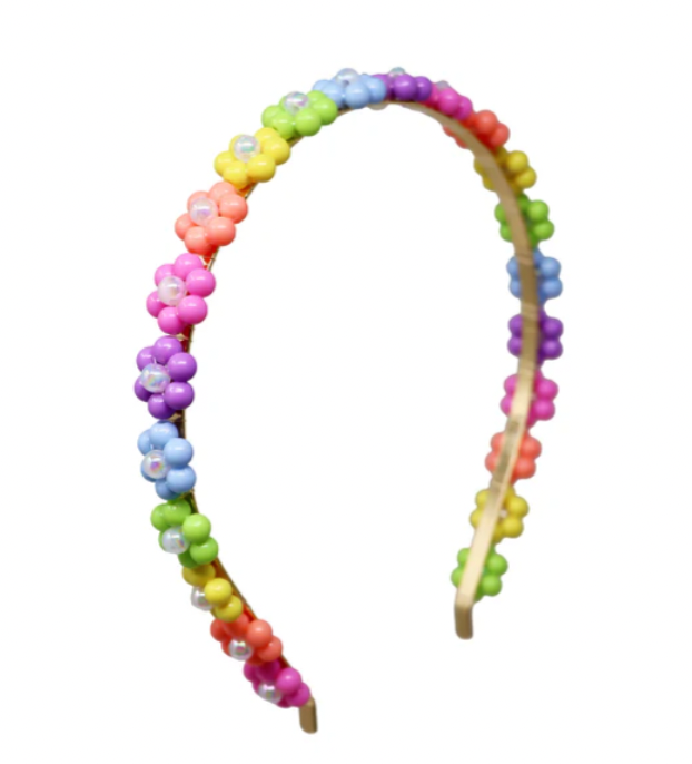 Brighten every outfit with the Daisy Pop Headband by Pink Poppy — a feel-good accessory made for those who love playful colour and happy vibes. Designed with pastel rainbow beads crafted into daisy shapes on a gold metal band.