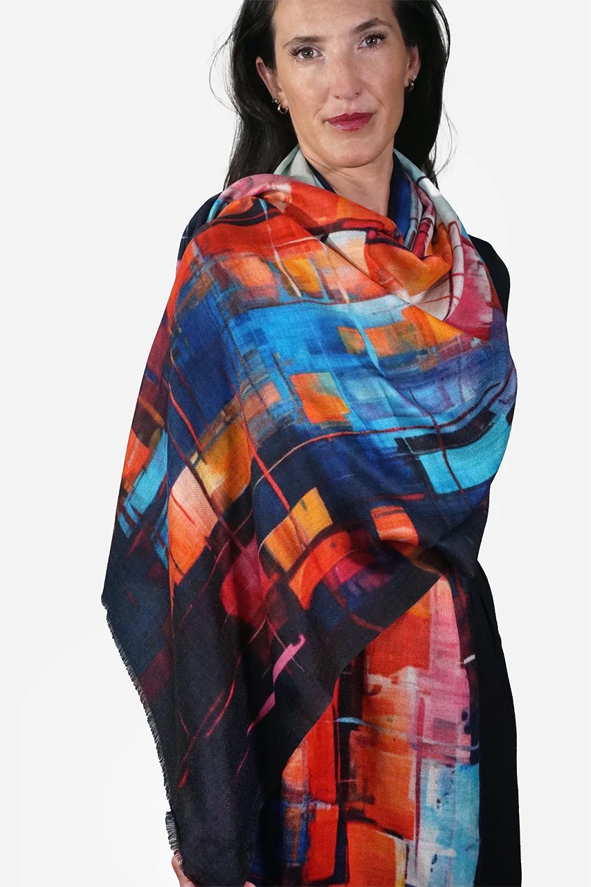 This stylish Australian merino wool scarf is an abstract, multicoloured design of rectangular shapes in warm and cool tones that merge with a black background. Our merino wool scarves are 70x200cm.