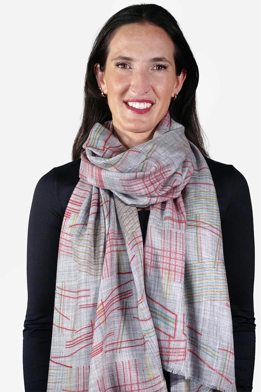 This stylish Australian merino wool scarf is a geometric, multicoloured design of random lines on a light grey background. Our merino wool scarves are 70x200cm.