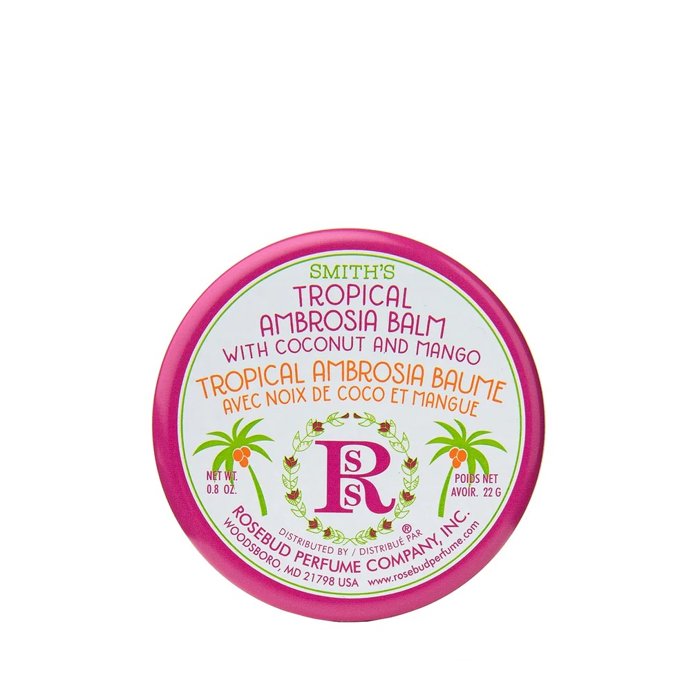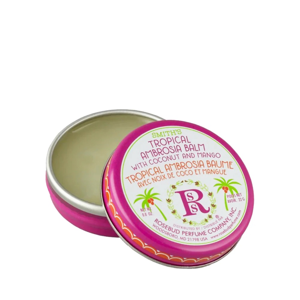 Smith Rosebud’s Tropical Ambrosia Balm is a creamy, buttery mélange of coconut with overtones of juicy mango. This delicate and soothing lip or body balm is delightfully softening. Try it on elbows or dry chaffed skin, especially hands and cuticles. This tropical nectar is especially good as an all-purpose skin illuminator. Apply liberally as needed throughout the day for soft, smooth and nourished lips, cuticles and skin.