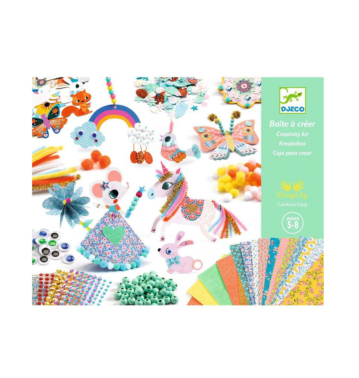 The perfect box to have on hand for the holidays, birthday parties, or a creative weekend. A profusion of supplies in a large 2-story box (beads, pompoms, googly eyes, stickers, gemstones, chenille stems, and more) for hours of creating. The set comes with a booklet filled with ideas for simple and beautiful designs. Several children can create together. Contents: a large supply box with two trays holds assortments of beads, pompoms, googly eyes, stickers, gemstones, chenille stems, and printed cards + 15 idea sheets.