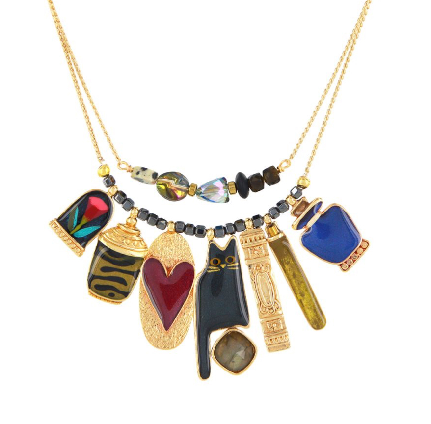 Composition : Etain, laiton, résines colorées dont les motifs sont peints à la main, poudre de mica, résine transparente, fil en viscose, labradorite, peinture dorée, perles en verre, hématite, spinelle noir, jaspe dalmatien, peinture metallisée, onyx, (Les pierres naturelles sont toutes uniques, elles peuvent présenter des variations de couleurs par rapport à la photo.)